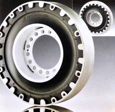 高彈性橡膠合金聯軸器主要部件是輪轂和法蘭體,其間安裝有圓盤狀的彈性元件。該元件內表面用硫化方法粘接,外表面與法蘭體采用插入式齒形。這個齒形具有軸向插入的特點,可補償軸向位移。聯軸器允許角度位移為0.5°。